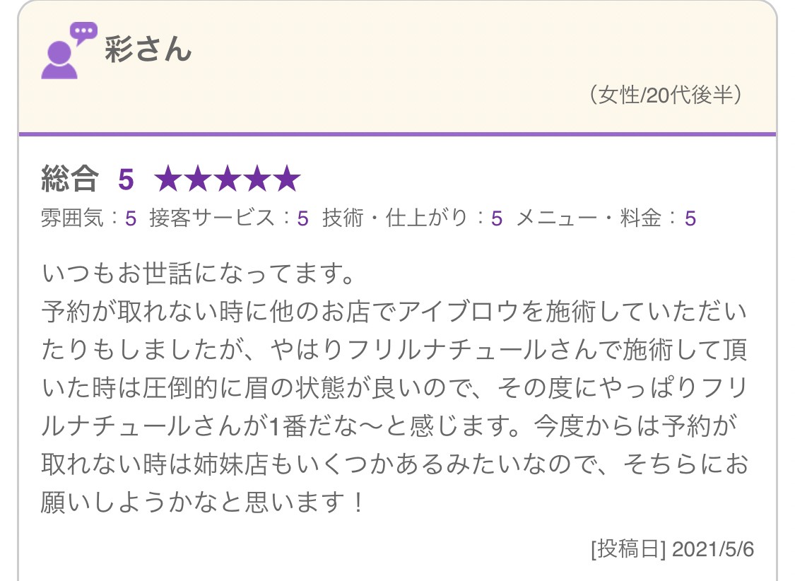 ありがたいことに次回予約をして帰られるお客様が多く、前日、数日前ですと予約がすでに埋まっている場合が多いです。お早めのご予約、お問い合わせが確実となっています。